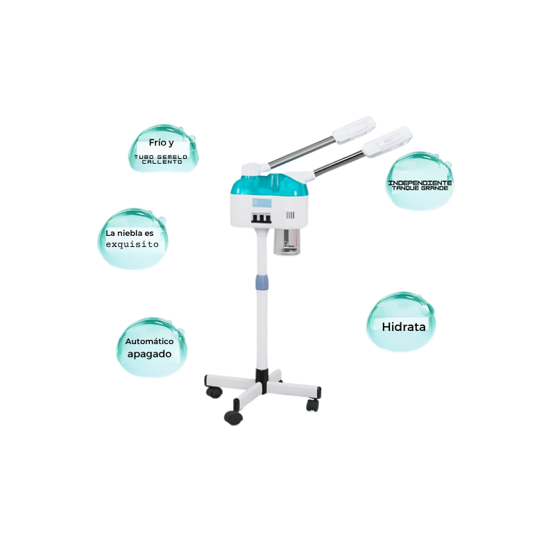 Este vaporizador facial profesional de pedestal, es un generador de vapor frio, vapor caliente y vaporozono, que promueve la salud y calidad de la piel, así como la regenera- ción de colágeno y la activación de agentes hidrofílicos que hacen que la piel se vea hidratada, lozana y nutrida. Gracias al vapor y al ozono, todos los tipos de piel se verán beneficiadas con su uso (piel grasa, seca, neutra mixta o sensible).